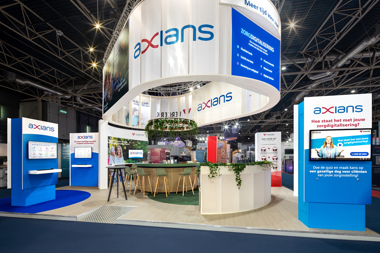 Axians NL & Verkerk Service Systemen approached us with a request to create a striking trade show booth for the annual Zorg & ICT trade show. These two organizations, each with their own unique identity, share booth space at the trade show.