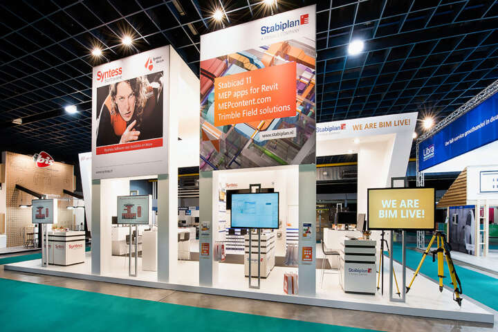 The joint booth of Syntess and Stabiplan immediately stands out due to its impressive size and ultra-sleek design.