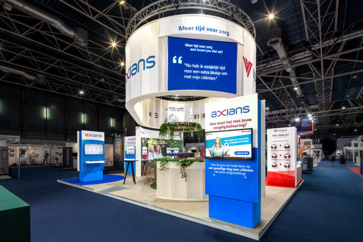 Een modulaire stand die ingezet kan worden op een beursoppervlakte van 8 m2, maar net zo makkelijk op 110 m2. Precies van die uitdagingen waar wij extreem vrolijk van worden.