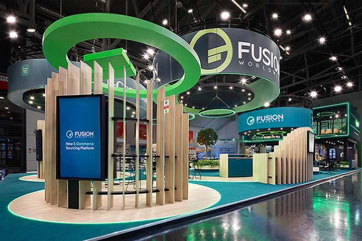 De beursstand was een statement an sich. De enorme, hangende cirkelvormige banners, met LED verlicht in de merkidentiteit van Fusion Worldwide, trokken bezoekers van veraf aan.