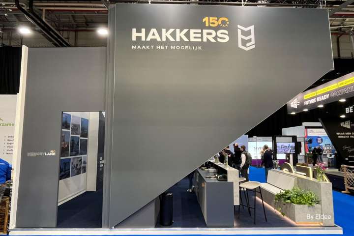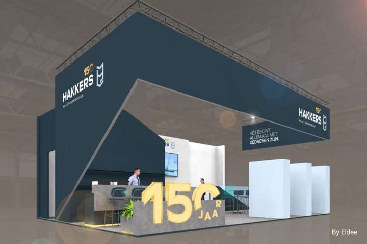 Met deze stand zette Hakkers een statement neer: 150 jaar innovatie en nog lang niet klaar met de toekomst. Een krachtige combinatie van historie, expertise en een vooruitstrevende blik, vertaald naar een opvallend en doordacht beursontwerp.