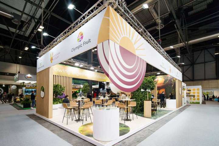 Voor optimale zichtbaarheid op de beursvloer is gekozen voor een grote ovale hangende banner met rondom branding. Deze zorgde voor sterke herkenbaarheid en trok al van veraf de aandacht van bezoekers.