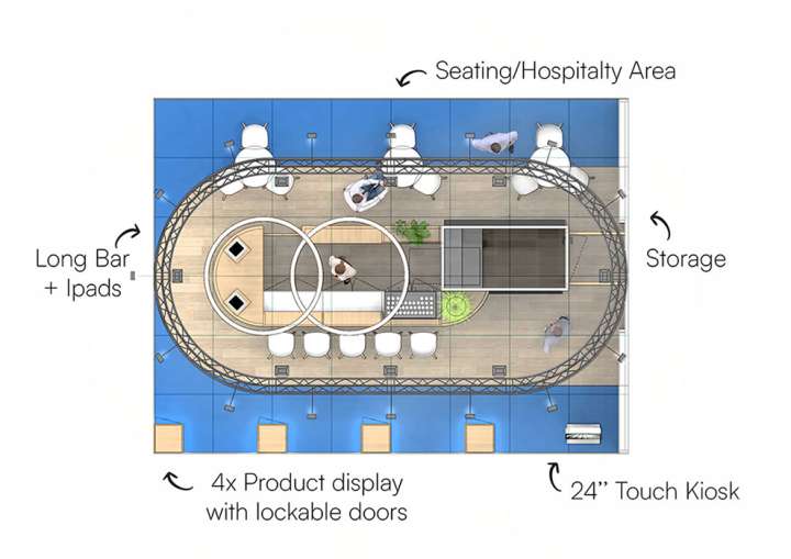 Het hart van de stand werd gevormd door een grote, ovale bar. Deze centrale ontmoetingsplek was professioneel ingericht, zodat bezoekers snel en gastvrij ontvangen konden worden. De open indeling zorgde voor een natuurlijke doorstroom en toegankelijkheid, wat resulteerde in een constante aanloop.